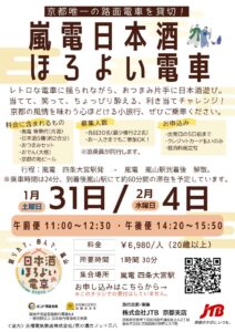 2026年1月31日(土)、2月4日(水)に「嵐電日本酒ほろよい電車~揺られて、呑んで、嵐山~」が開催されます。