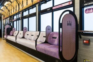 外観は伝統的なラウンドフォルムに現代的な水平基調を組み合わせ、京紫を纏う車体が京都の街並みに調和しながらも時代を超えて彩りを添えるデザインとした。内装にもラウンド形状を随所に展開、モノトーン基調にブランドカラーの京紫とシンボルマークをアクセントに配し、快適さの中に京都らしい華やかで特別な雰囲気を演出。伝統と革新が響き合う新たな京都の風景となる車両。