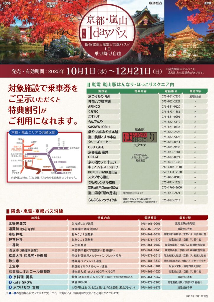 阪急電車と嵐電と京都バス(嵐山・嵯峨野エリア)が1日乗り降り自由となる「京都・嵐山1dayパス」が10月1日(水)から発売開始となります。