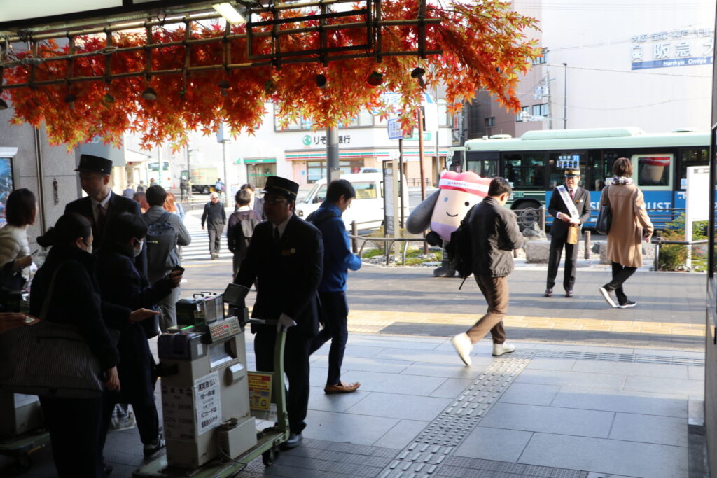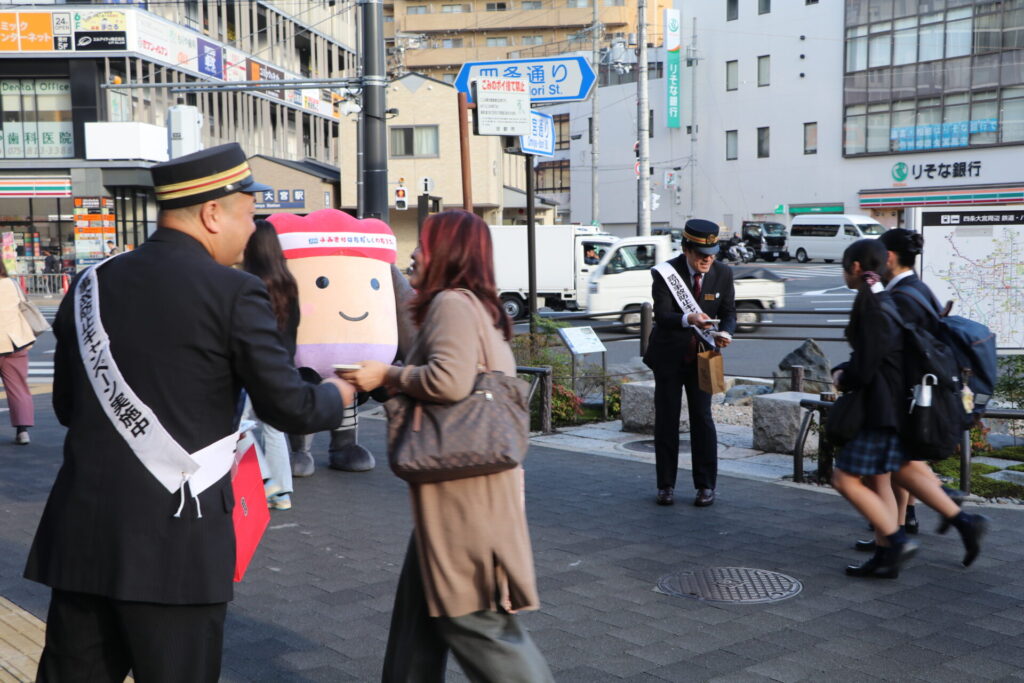 11月4日(火)朝、四条大宮駅で、近畿運輸局の方、当社職員、マスコットキャラクター「あらん」が、ご乗車のお客様などに、キャンペーンミニチラシが入った「貼るカイロ」の小袋などを配布してご協力を呼びかけました。