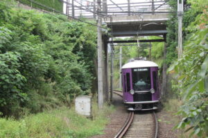京都市に残る路面電車「嵐電」で、24年ぶりに採用された新車両である。昔の嵐電車両をオマージュしたと言われるデザインは、その丸みが確かに懐かしさをそそる。会社として揃えていく車両色「京紫」は、京都のイメージを象徴した色であり、白との2色づかいが現代的で、正面の丸いレトロ感のあるライトと黒いフロントガラスが、締りある顔つきを見せている。インテリアのシートが見せる柔らかさとは対照的だ。